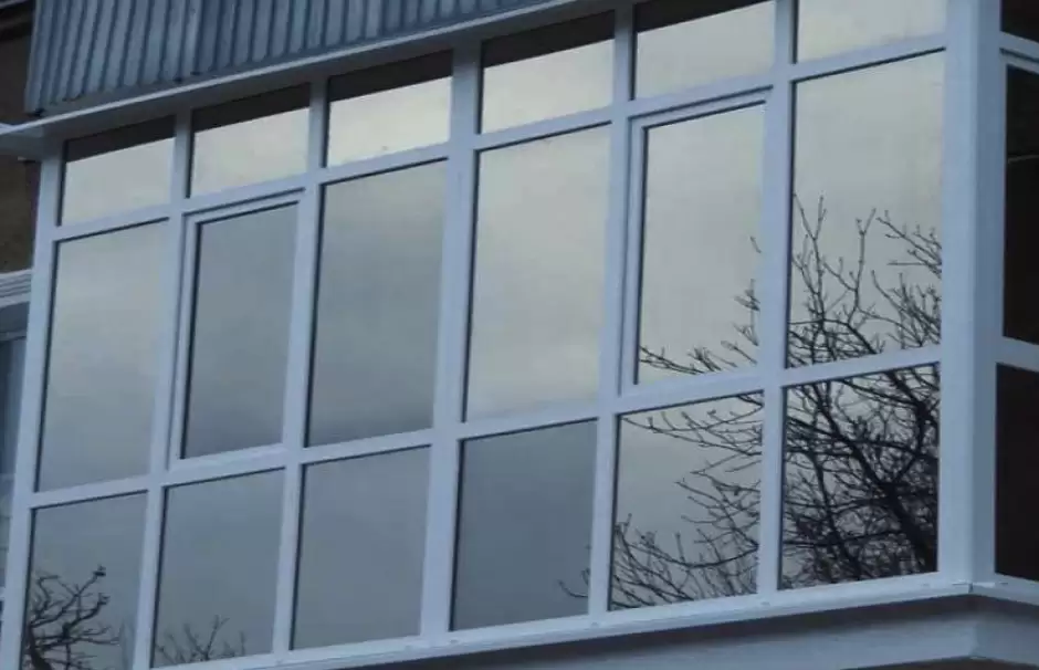 Панорамное остекление на данном балконе выполнено после демонтажа парапета. Выбран холодный тип остекления из алюминия с поворотными створками. Лёгкая тонировка стёкол. Работы проводились на 5 этаже и включали: