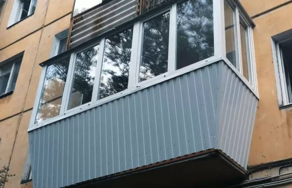 Остекление балкона с выносом по 3-м сторонам перепета. Кронштейны под вынос от балконной плиты, расширение к верху - 20 см. Полутёплое остекление с 1 стеклопакетом, алюминиевый профиль, открывание - раздвижное. Внешняя отделка балкона профнастилом. В этапы работ входило:
