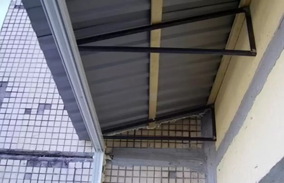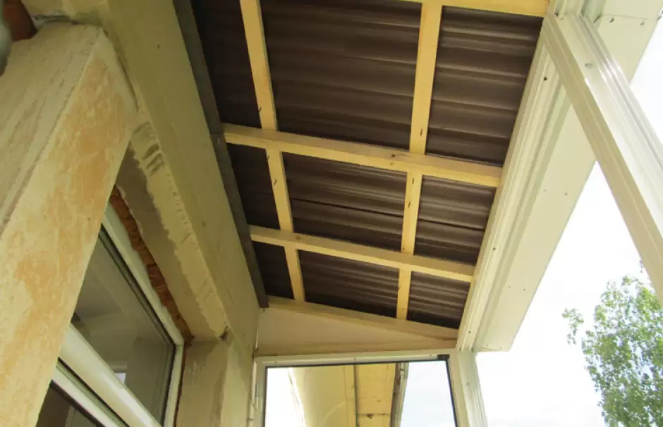 Установка деревянной крыши с кровлей из профнастила на балконе